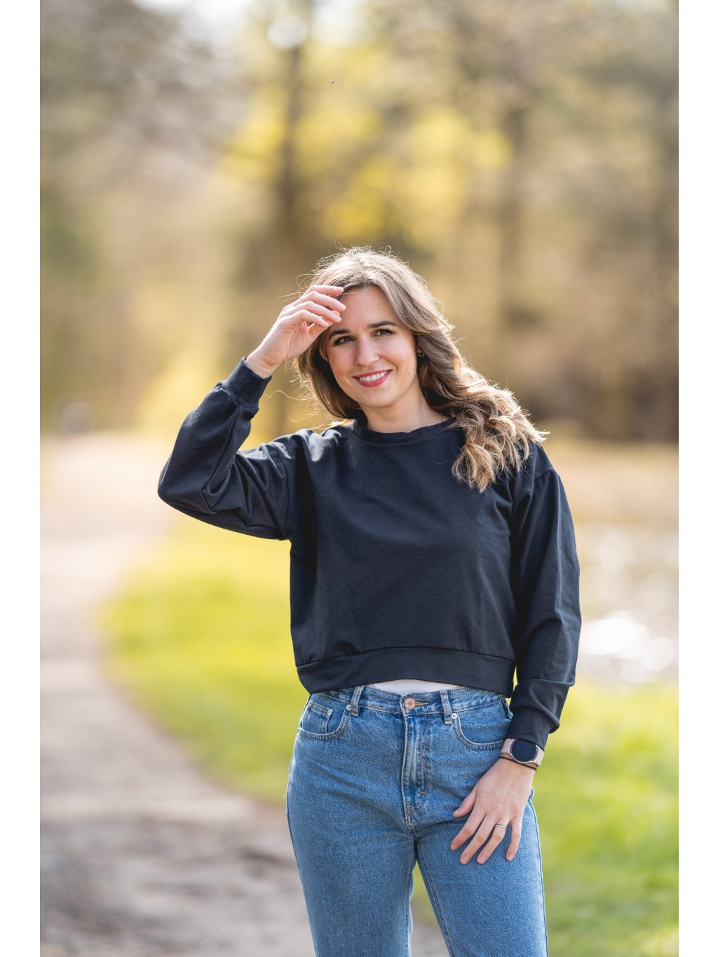 - Mikina širší, kratšího střihu s širším lemem v pase