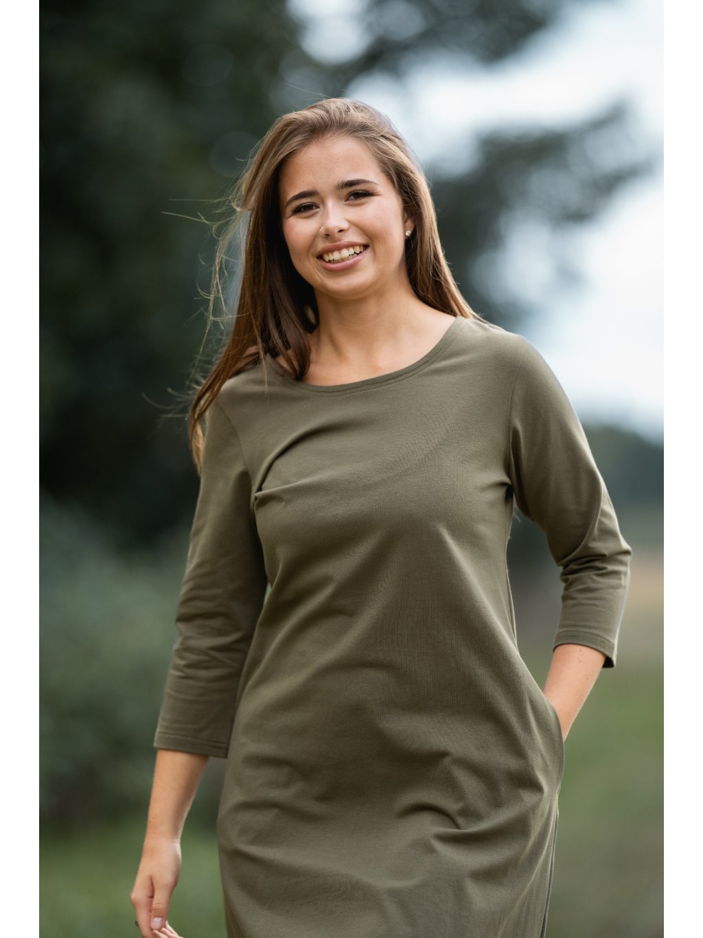 Popis: šaty áčkového střihu, dole více rozšířené, pro ty, kteří mají širší boky a namají rádi upnuté, 3/4 rukáv, kapsy ve švu