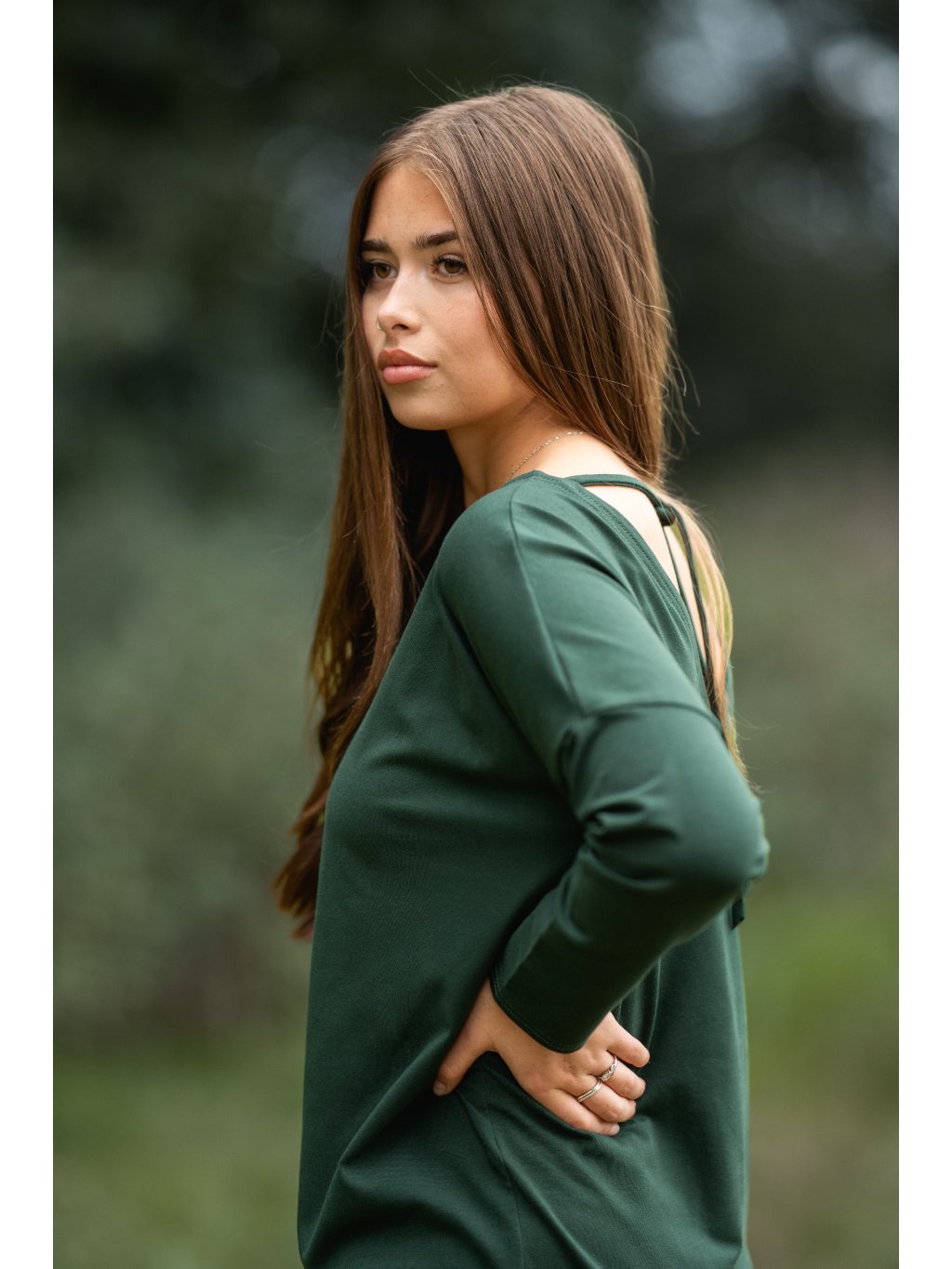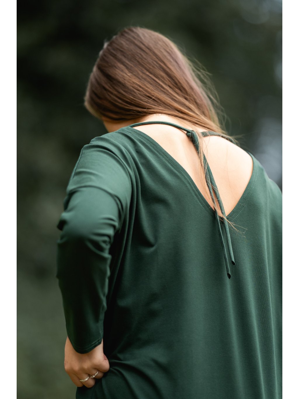 - nahoře volnější s velkým V výstřihem na zádech, abyste se v létě nepotila a vazačkou, aby šaty nepadaly