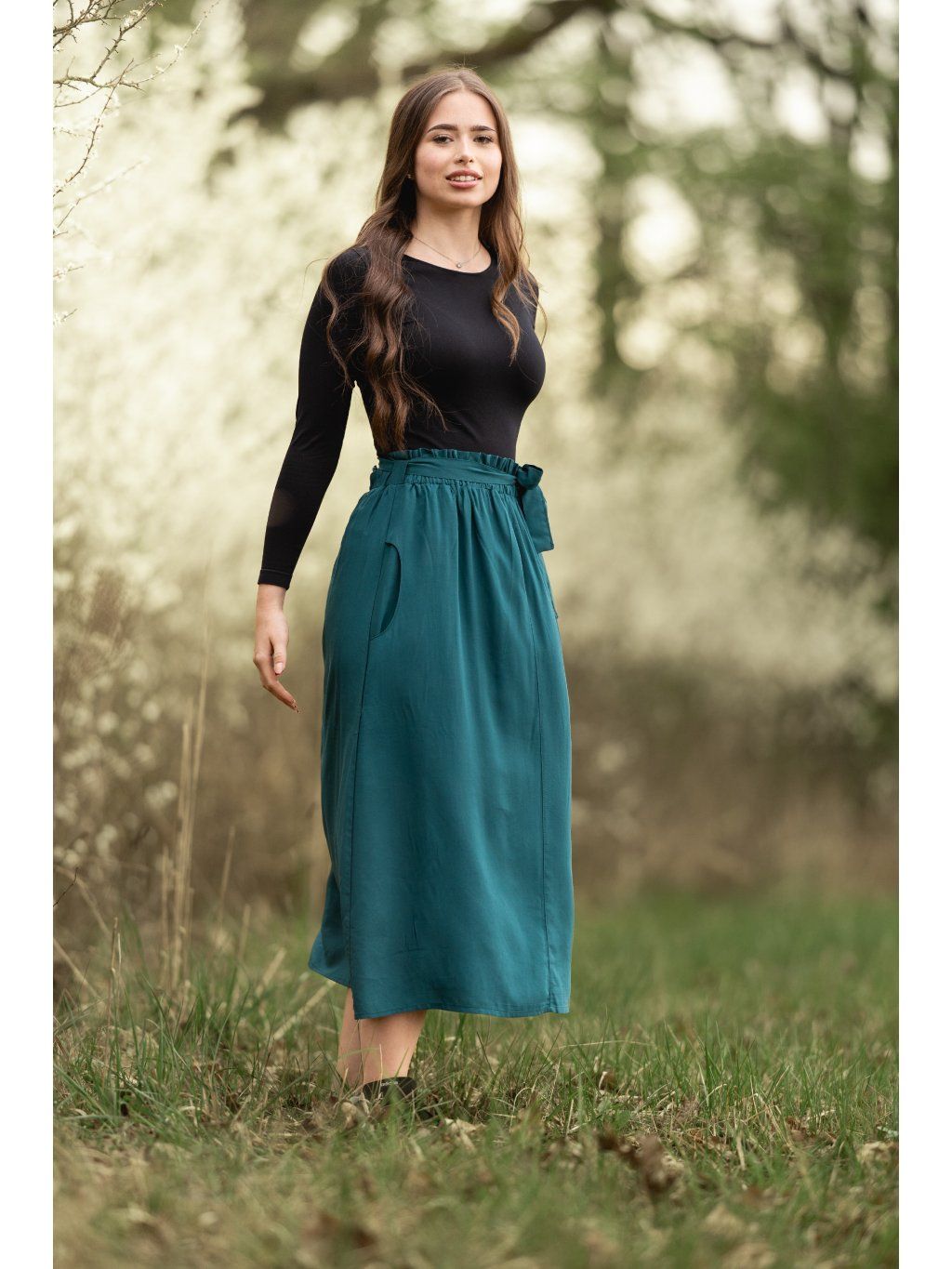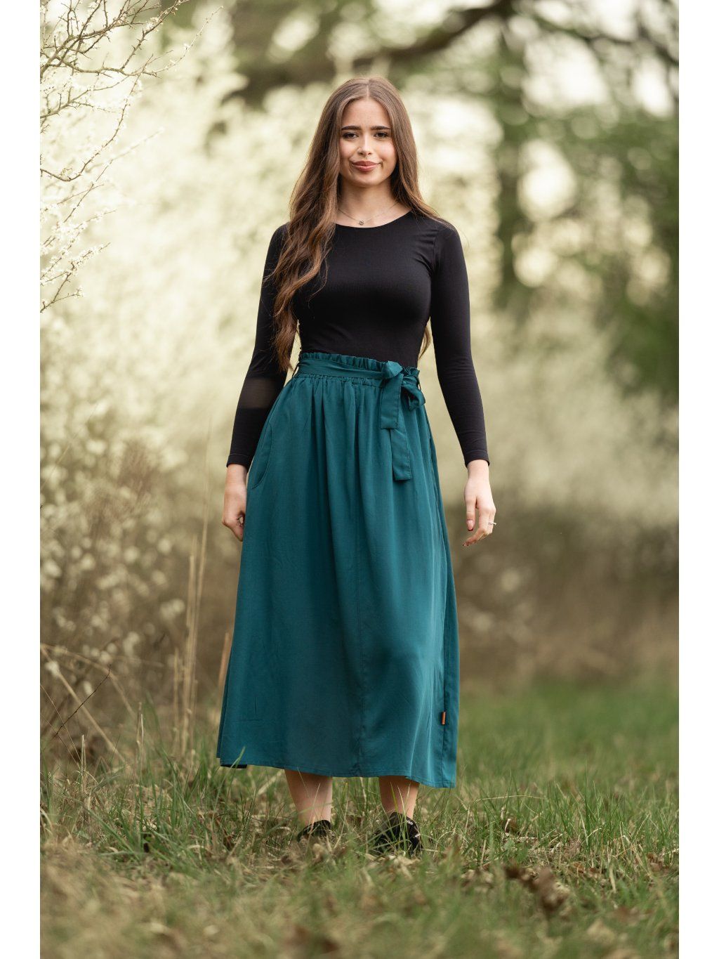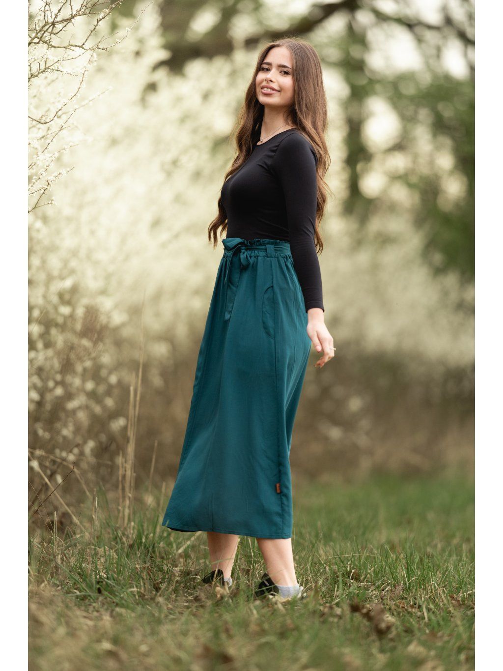 Má pohodlnou gumu v pase, praktické kapsy a lichotivou midi délku, kterou unosíš od rána do večera.