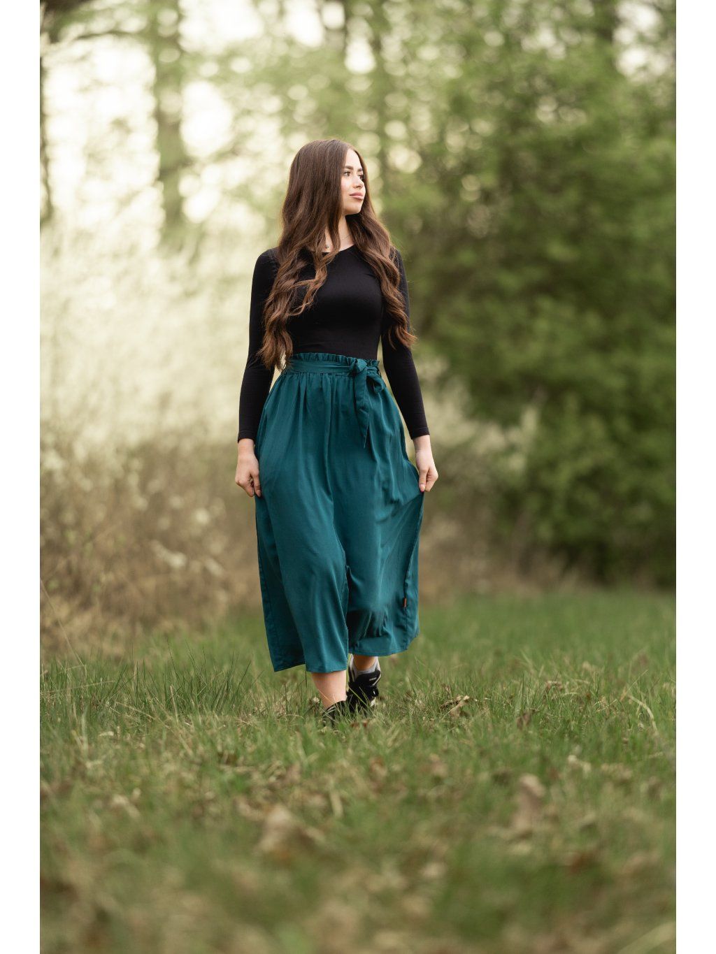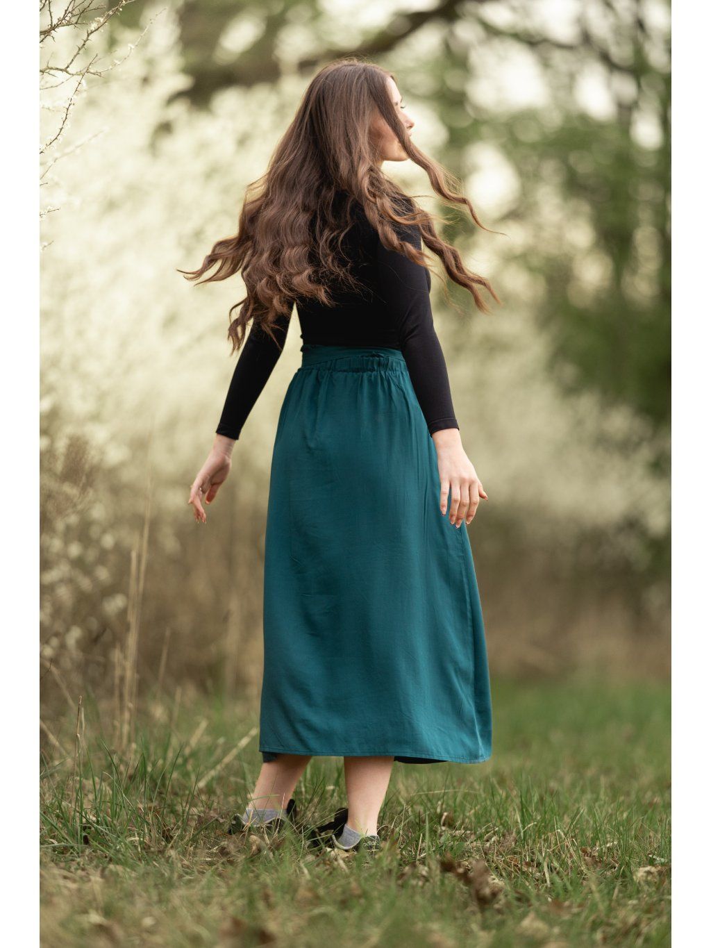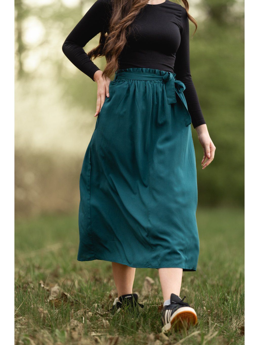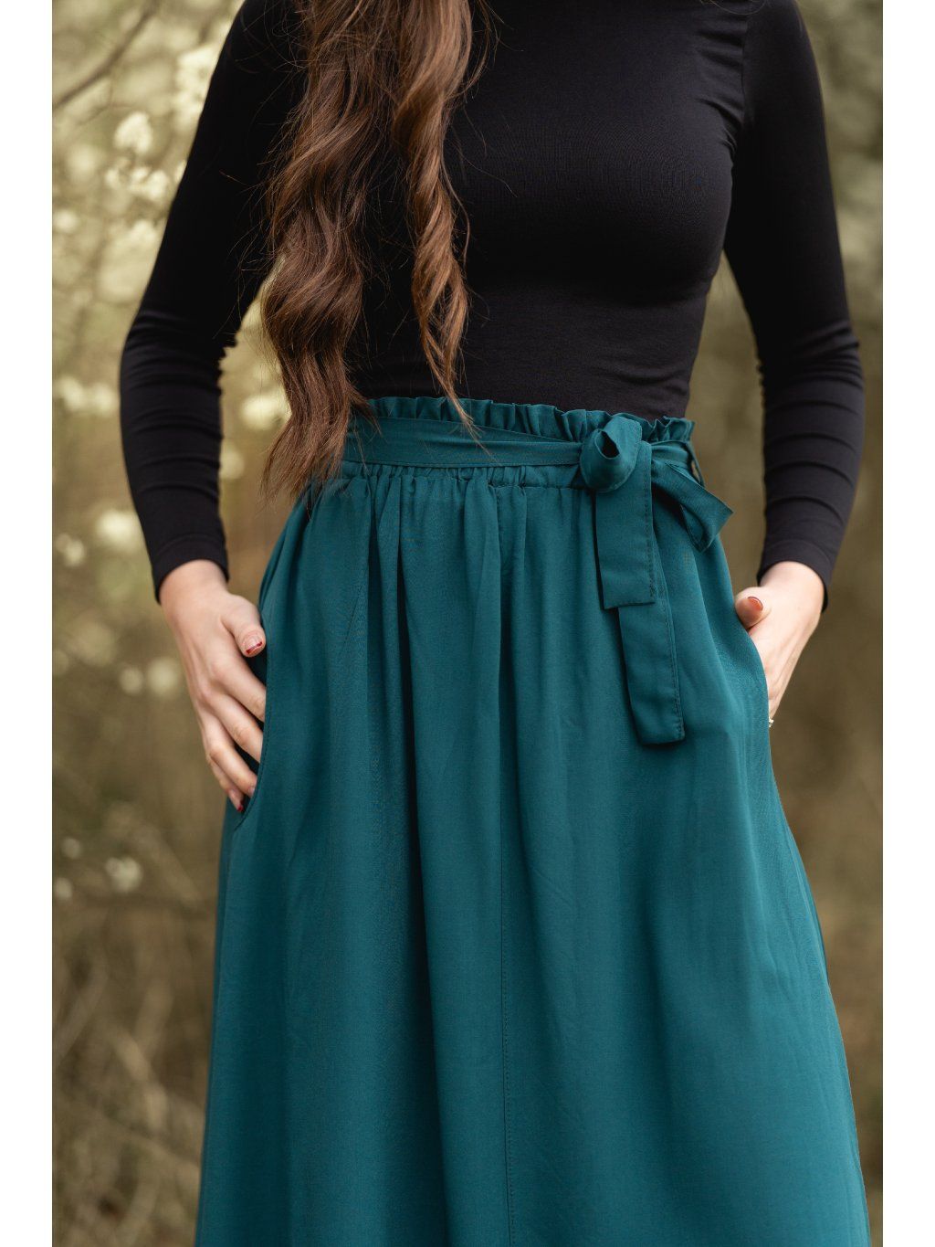 - Sukně je v pase na gumu s okrasným lemem, který dodá na dokonalosti.
