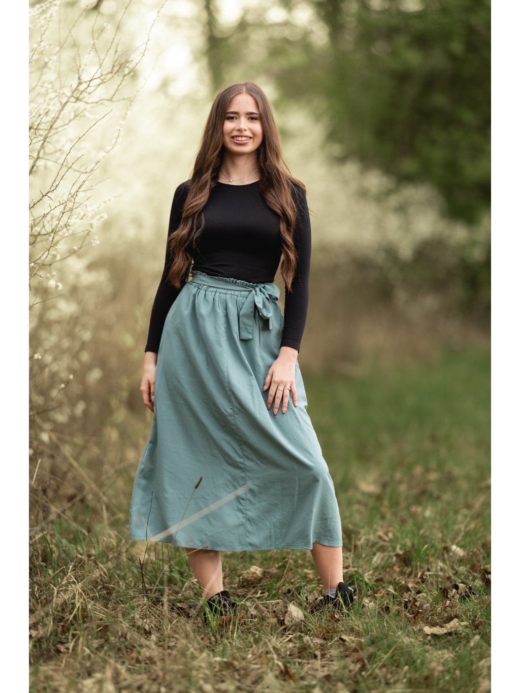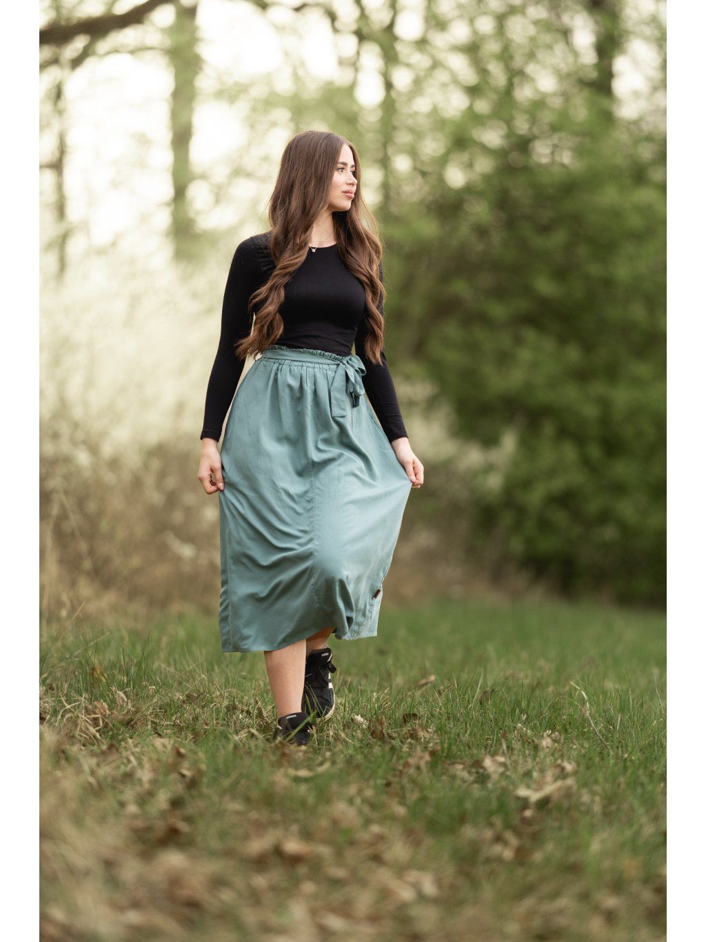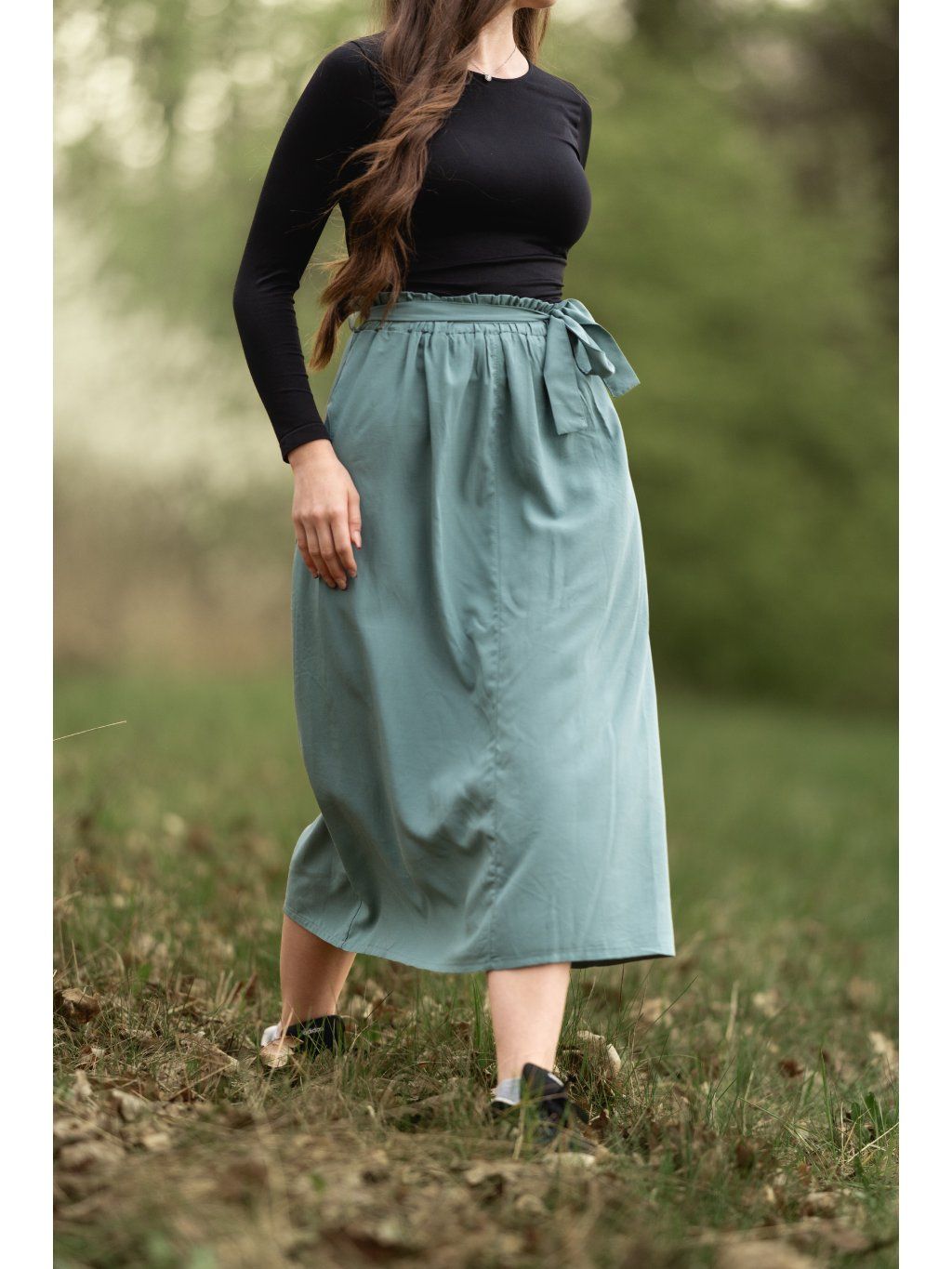 Má pohodlnou gumu v pase, praktické kapsy a lichotivou midi délku, kterou unosíš od rána do večera.